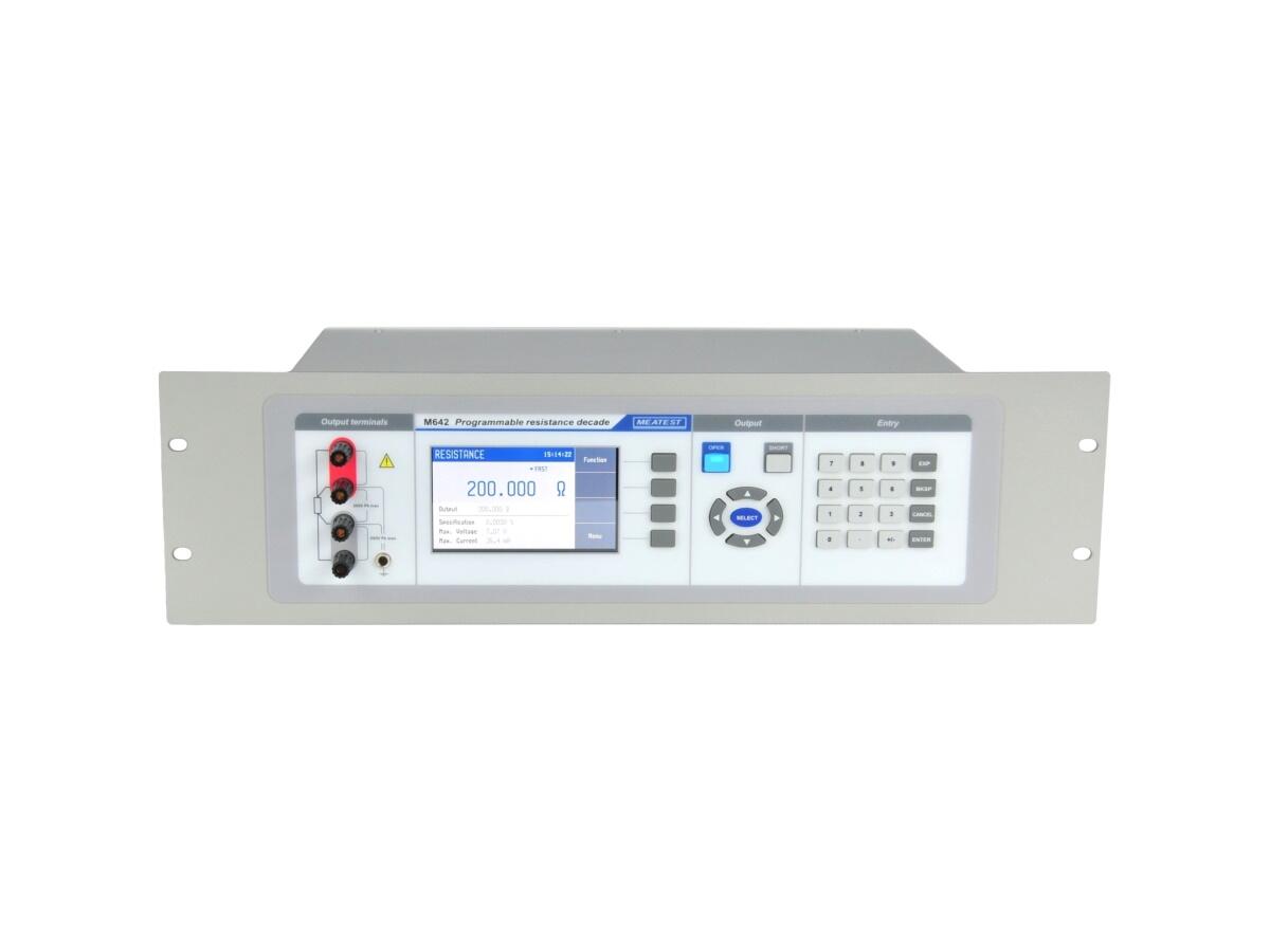 M642 is programmable real-resistance decade for industrial use. Its far-reaching 0.1 Ω - 20 MΩ range (22 MΩ upgrade available), fine resolution, solid 0.02% accuracy and 5 W load capacity will fit any application. Floating output terminals of M6xx decades allow for AC measurements as well, see datasheet for typical frequency responses.