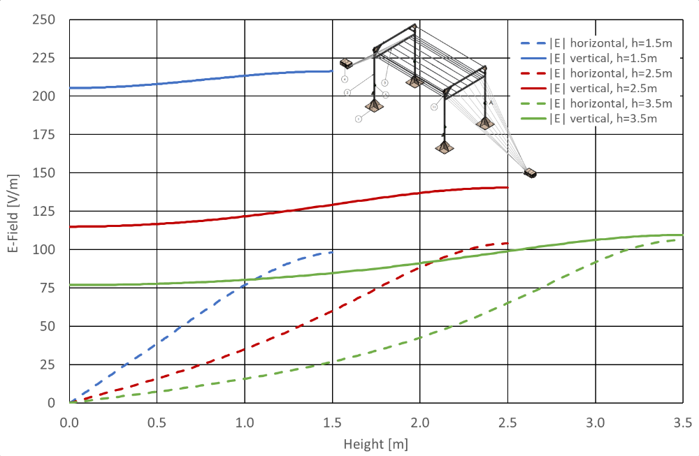 Theoretical electric field for an input power of 1 kW and different septum heights (1.5, 2.5 and 3.5 m) for both vertical and horizontal E-field orientations. The losses of the transformers and the effect of the chamber are neglected.